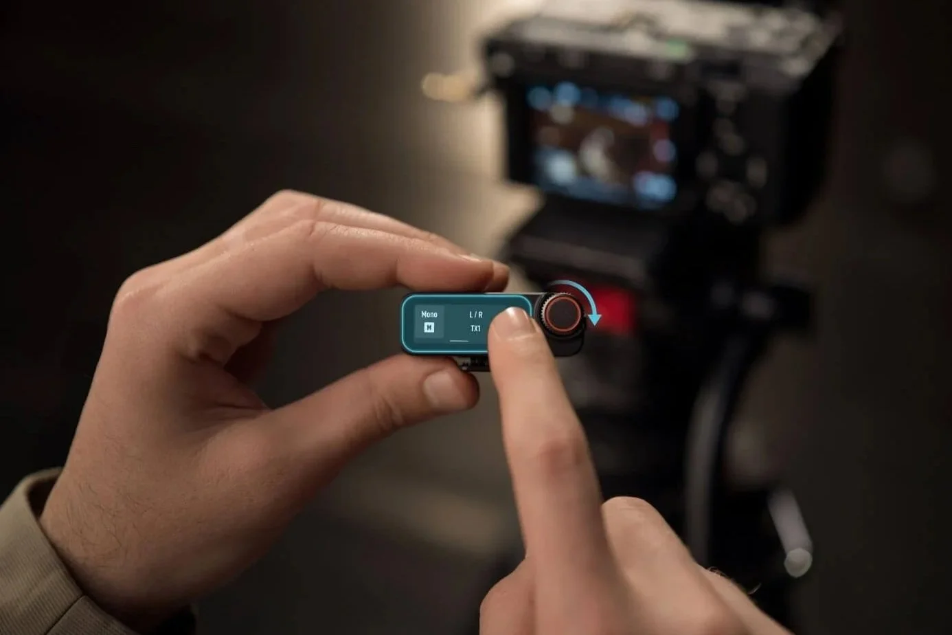 Il TX pesa 16 g: più piccolo e discreto del Mic 2, con clip ruotabile e opzioni magnetiche migliorate. Il case è riprogettato per ospitare tutto (clip, magneti, parabrezza, cavi) e regge un’intera giornata di riprese. Sul RX c’è un display da 1,1" con rotella per impostazioni rapide.