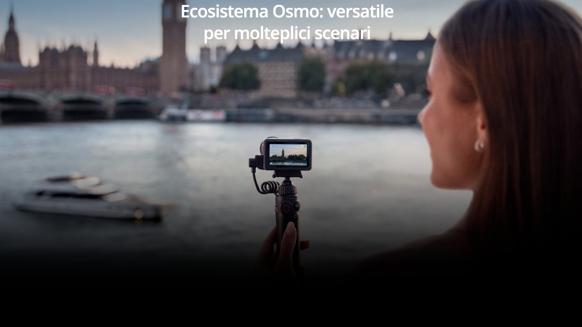 Ecosistema audio OsmoAudio migliorato: connessione diretta fino a due trasmettitori DJI Mic, più gestione intelligente del rumore del vento con i tre microfoni integrati.