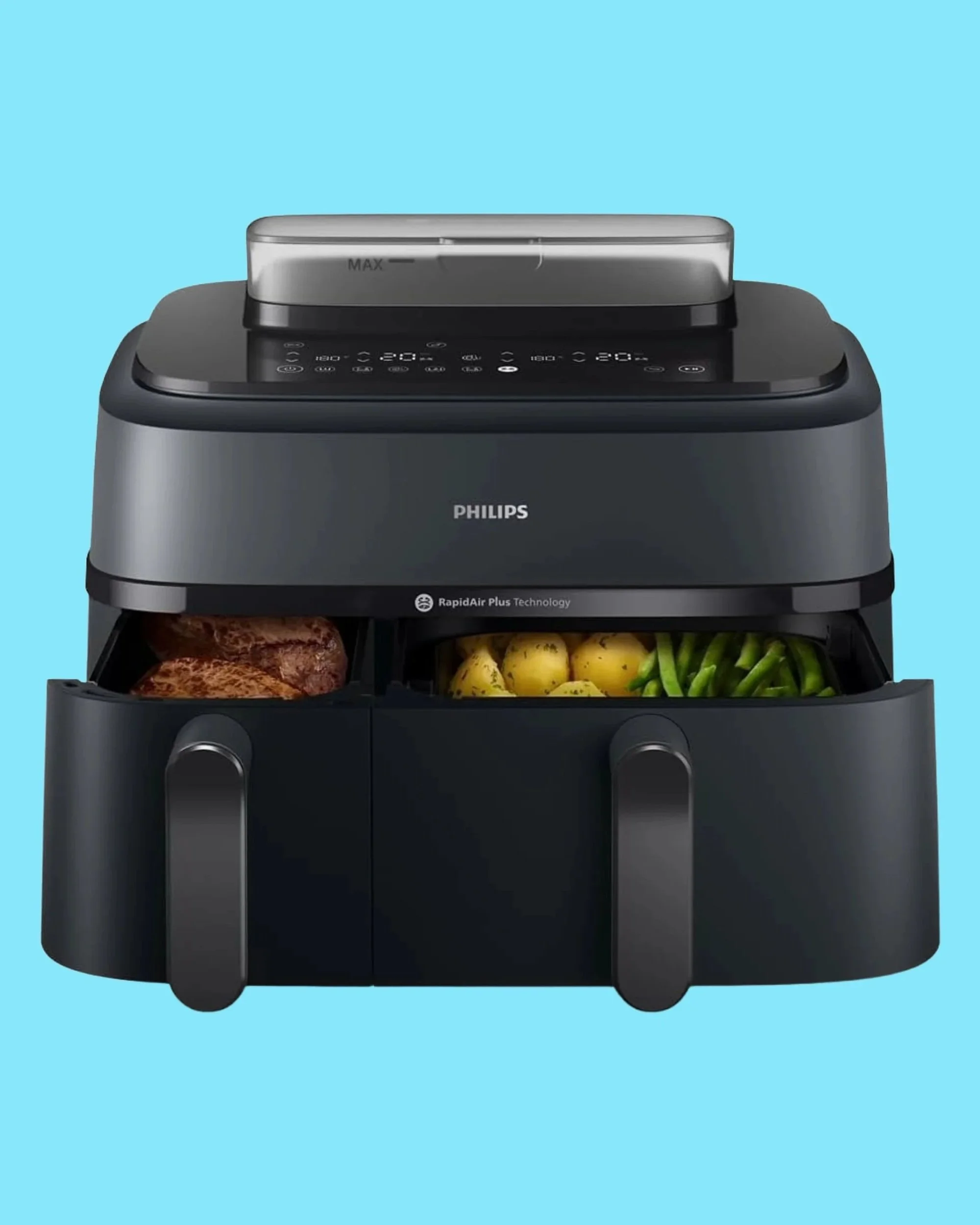 Friggitrice ad aria con doppia resistenza superiore e doppio cestello con capacità fino a 8,3 litri/2,2Kg, per preparare un pasto completo pronto in una sola volta, da 6 a 8 persone