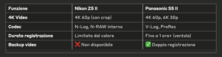 La Nikon Z5 II è ideale per chi dà priorità alla resa fotografica e alla naturalezza del colore. La Panasonic S5 II è comunque ottima, ma nasce con un’anima più orientata al video.
